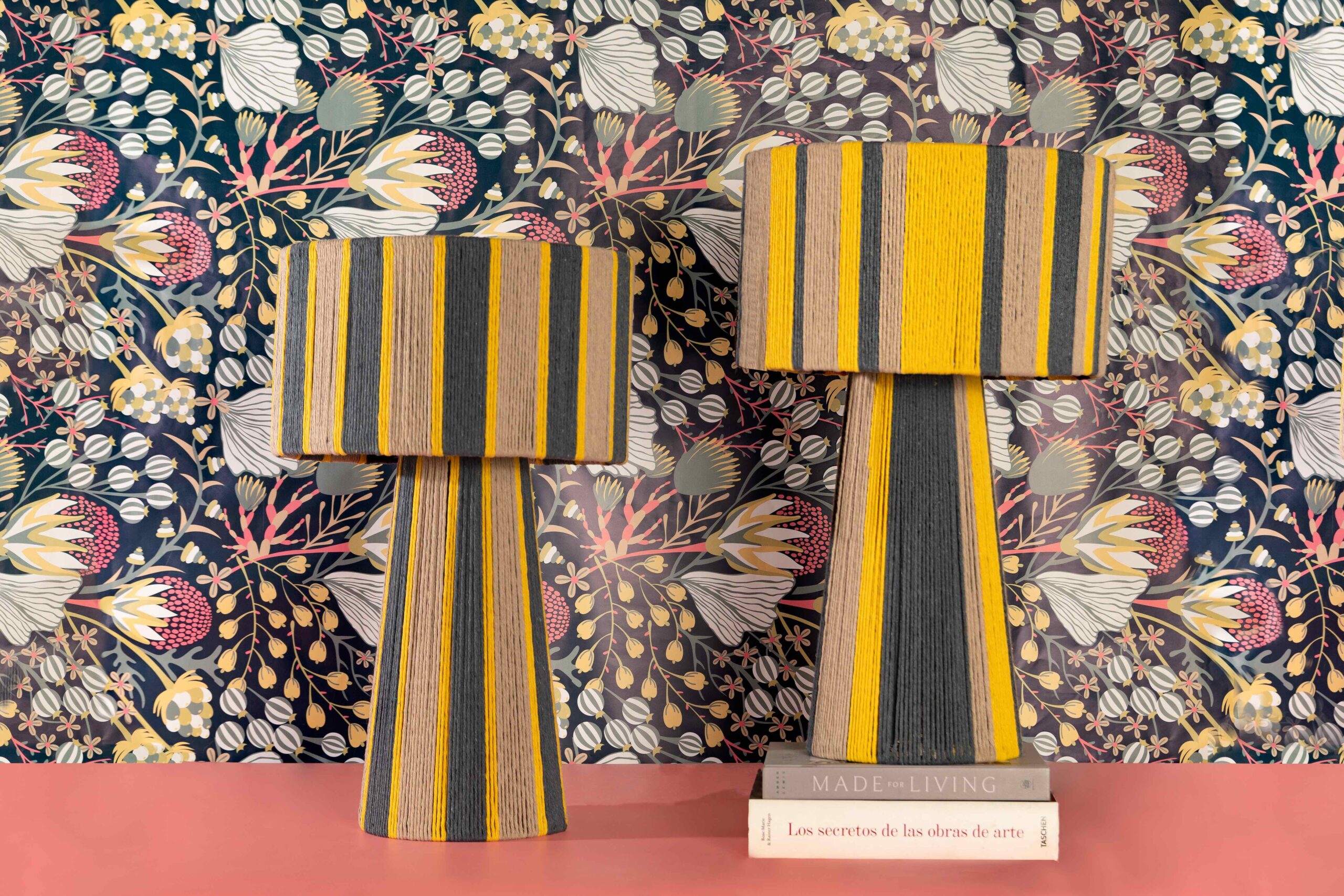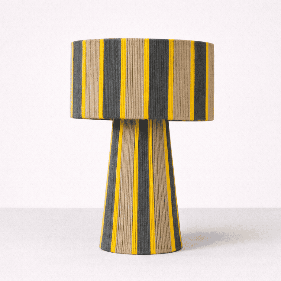 combinando una estructura firme y equilibrada con el toque suave del algodón cuidadosamente entrelazado. Su diseño se distingue por sus líneas limpias y proporcionadas, y por una caída visual que envuelve la pantalla y la base con armonía y presencia. La verticalidad de su forma aporta calidez, carácter y un efecto visual que realza cualquier ambiente.