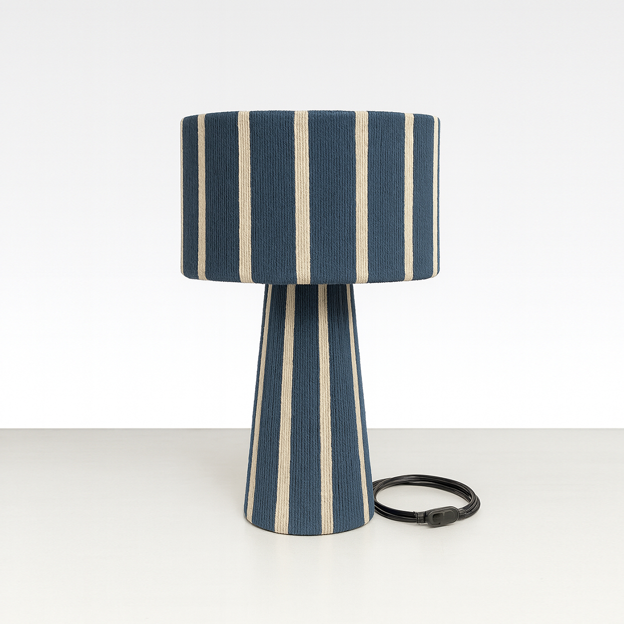 combinando una estructura firme y equilibrada con el toque suave del algodón cuidadosamente entrelazado. Su diseño se distingue por sus líneas limpias y proporcionadas, y por una caída visual que envuelve la pantalla y la base con armonía y presencia. La verticalidad de su forma aporta calidez, carácter y un efecto visual que realza cualquier ambiente.