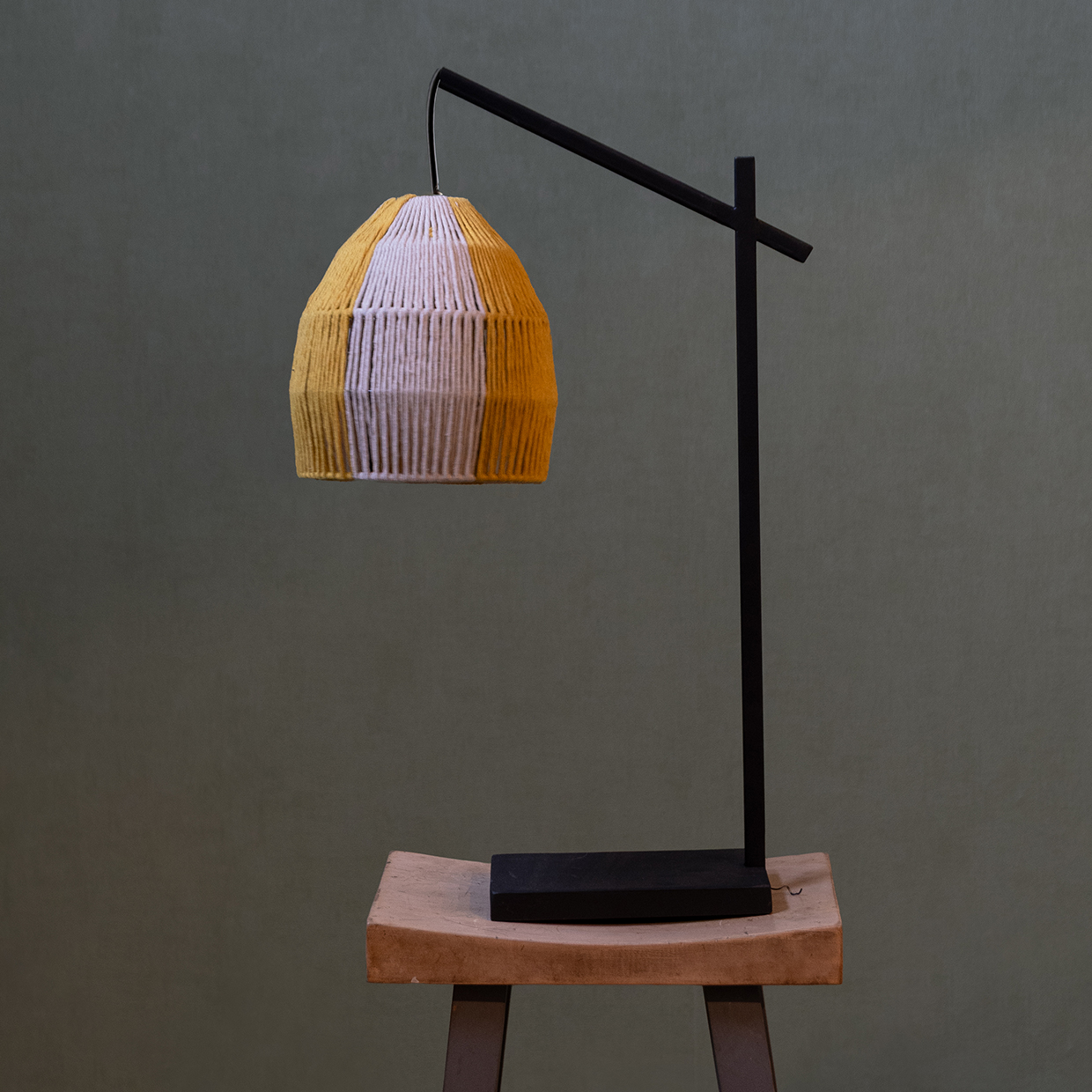 combina una estructura firme y estilizada con la suavidad del algodón entrelazado, creando un contraste equilibrado entre líneas definidas y textura acogedora. Su diseño proyecta luz focalizada y cálida, perfecta para rincones, mesas laterales o espacios que buscan un toque moderno y sutil.