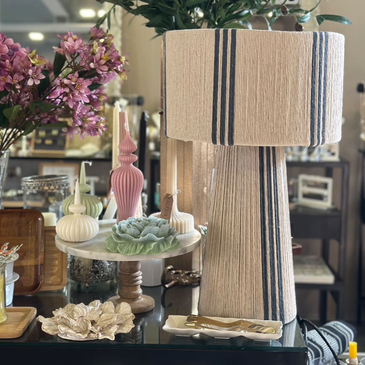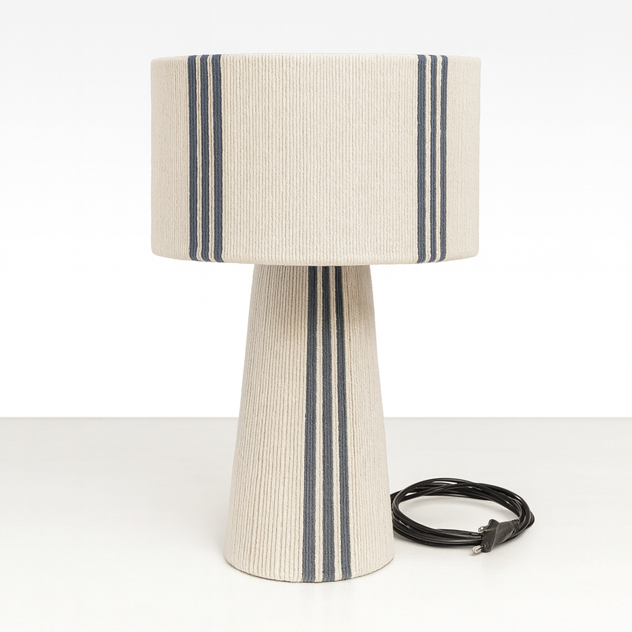 combinando una estructura firme y equilibrada con el toque suave del algodón cuidadosamente entrelazado. Su diseño se distingue por sus líneas limpias y proporcionadas, y por una caída visual que envuelve la pantalla y la base con armonía y presencia. La verticalidad de su forma aporta calidez, carácter y un efecto visual que realza cualquier ambiente.