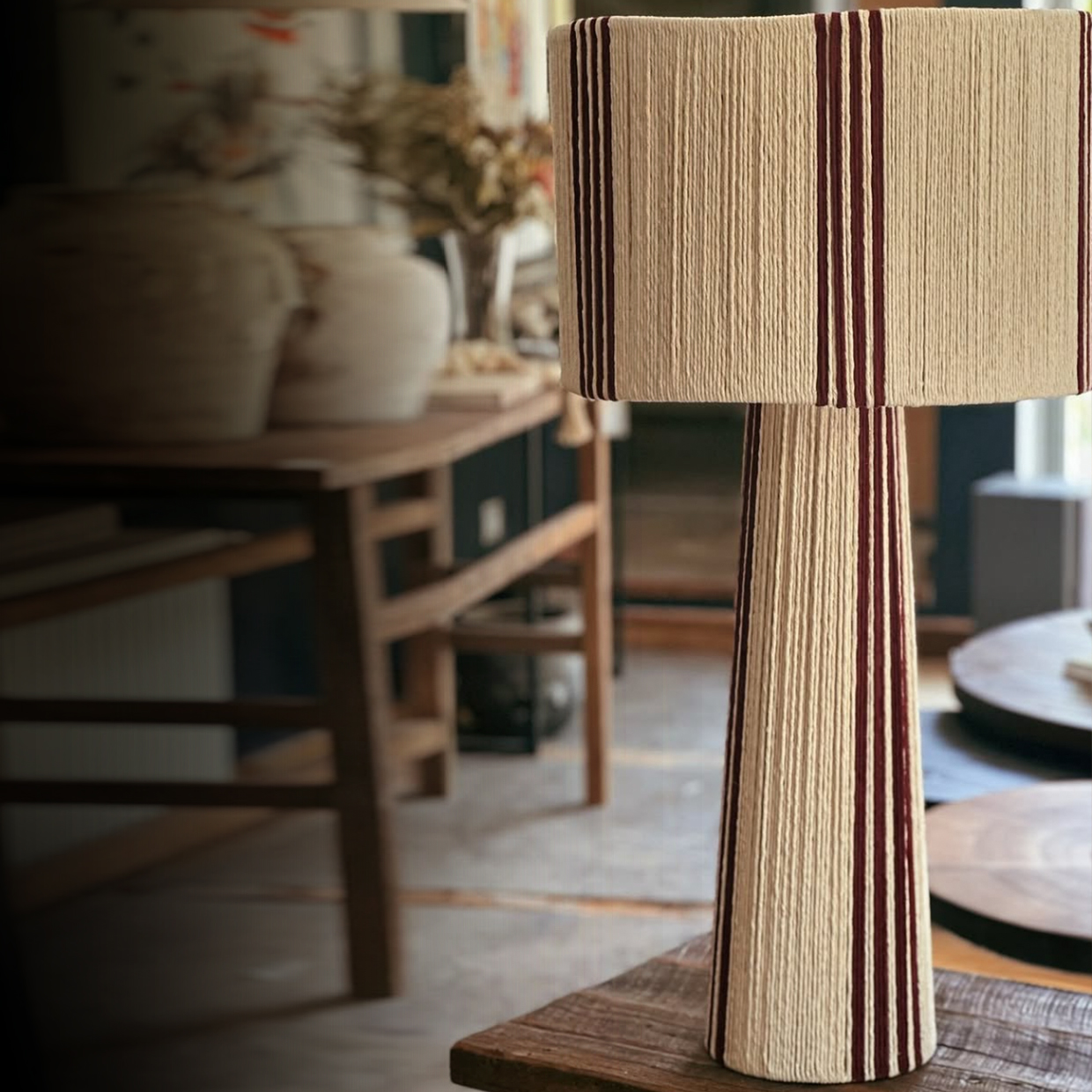 combinando una estructura firme y equilibrada con el toque suave del algodón cuidadosamente entrelazado. Su diseño se distingue por sus líneas limpias y proporcionadas, y por una caída visual que envuelve la pantalla y la base con armonía y presencia. La verticalidad de su forma aporta calidez, carácter y un efecto visual que realza cualquier ambiente.