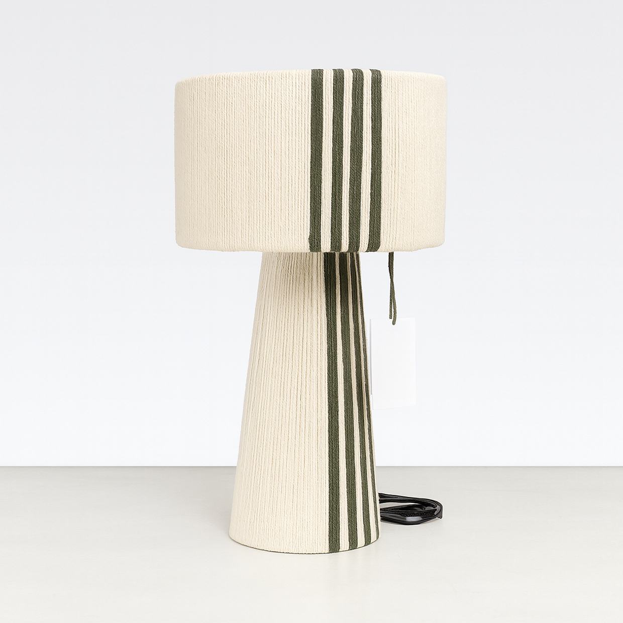 combinando una estructura firme y equilibrada con el toque suave del algodón cuidadosamente entrelazado. Su diseño se distingue por sus líneas limpias y proporcionadas, y por una caída visual que envuelve la pantalla y la base con armonía y presencia. La verticalidad de su forma aporta calidez, carácter y un efecto visual que realza cualquier ambiente.