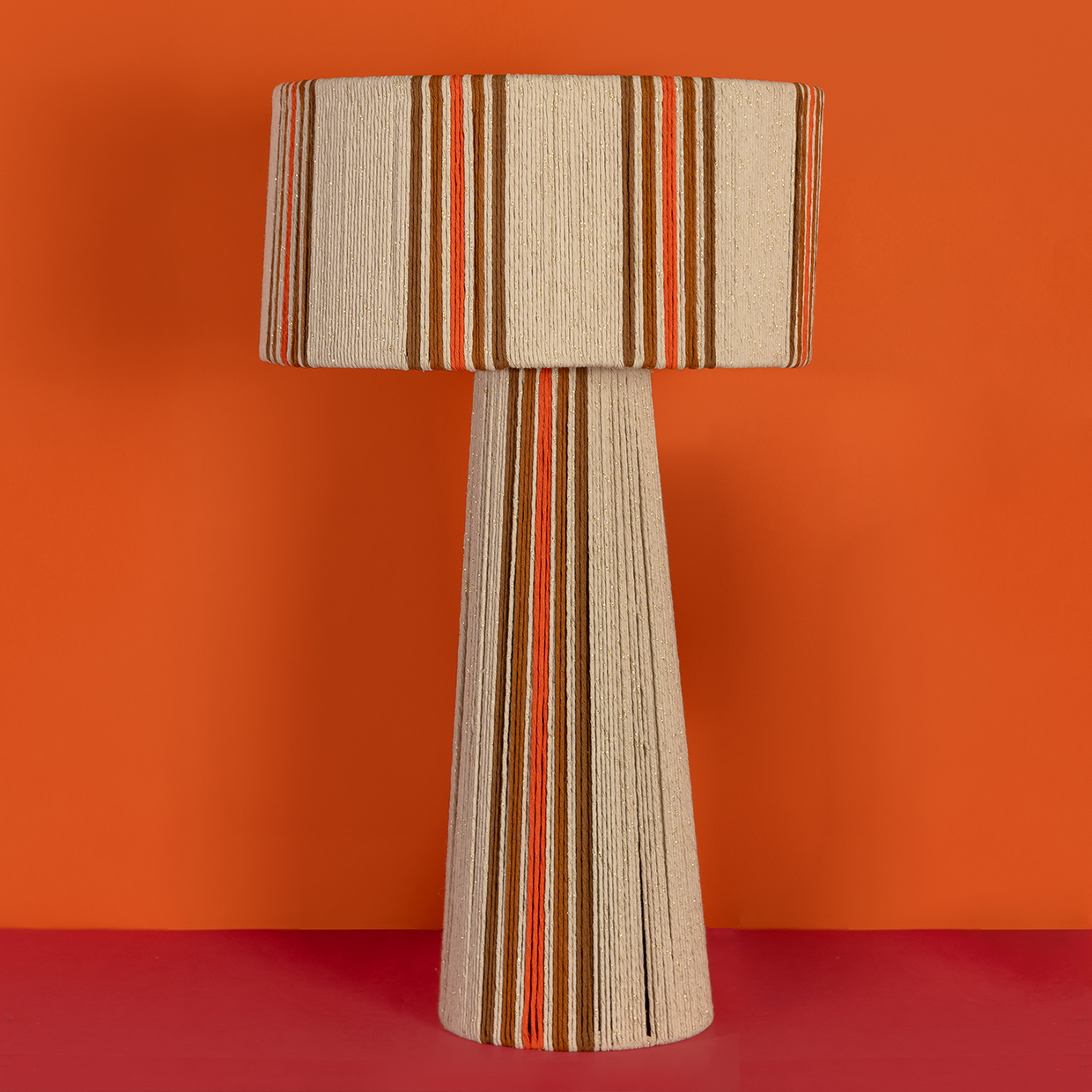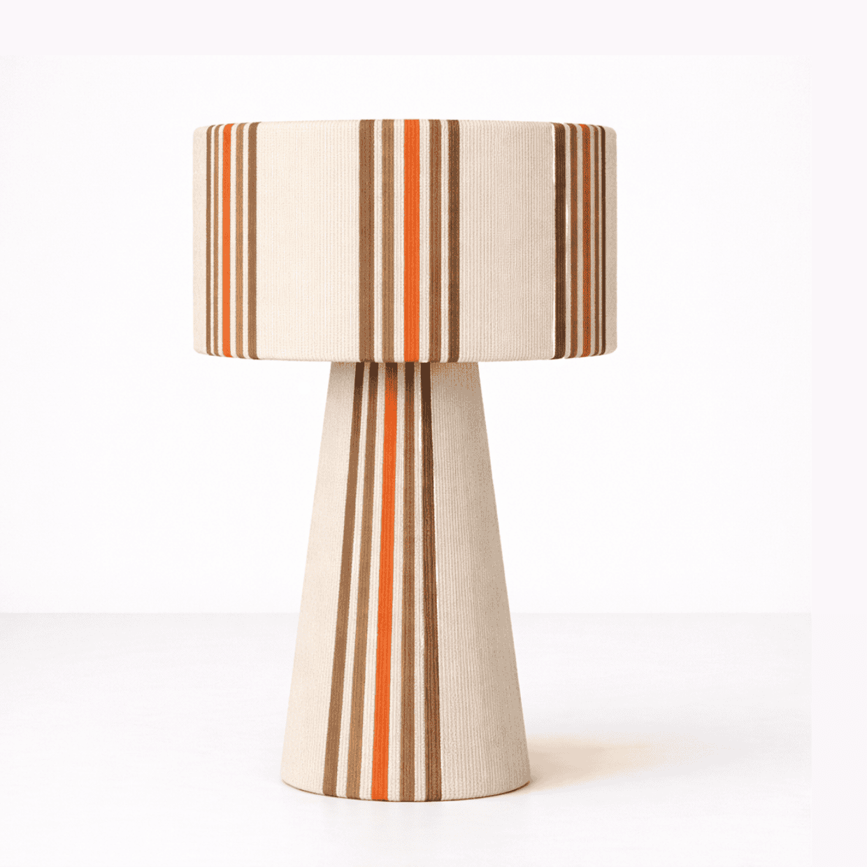 combinando una estructura firme y equilibrada con el toque suave del algodón cuidadosamente entrelazado. Su diseño se distingue por sus líneas limpias y proporcionadas, y por una caída visual que envuelve la pantalla y la base con armonía y presencia. La verticalidad de su forma aporta calidez, carácter y un efecto visual que realza cualquier ambiente.