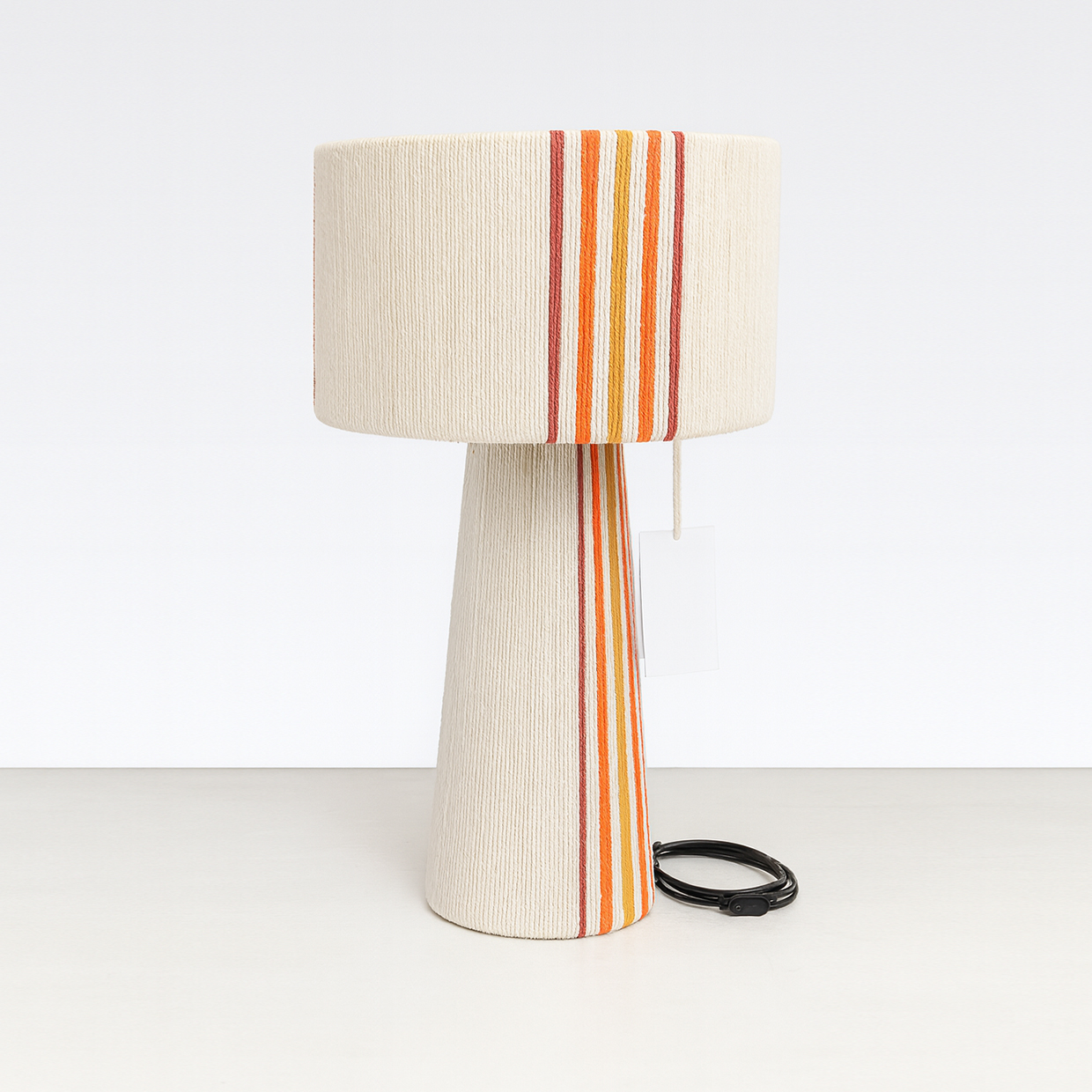 combinando una estructura firme y equilibrada con el toque suave del algodón cuidadosamente entrelazado. Su diseño se distingue por sus líneas limpias y proporcionadas, y por una caída visual que envuelve la pantalla y la base con armonía y presencia. La verticalidad de su forma aporta calidez, carácter y un efecto visual que realza cualquier ambiente.