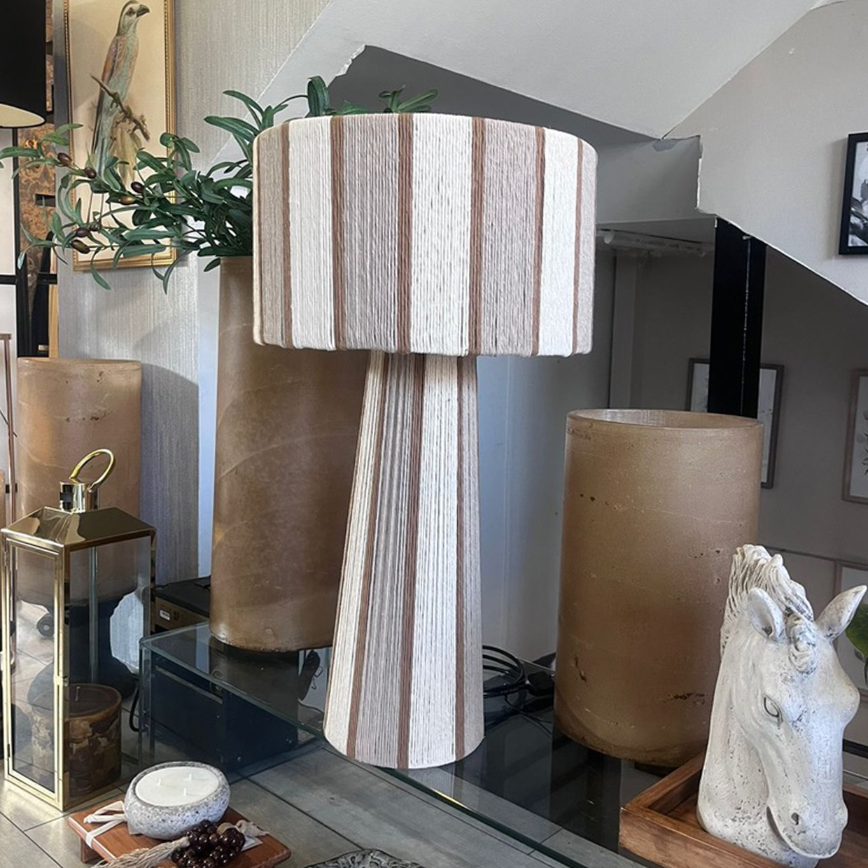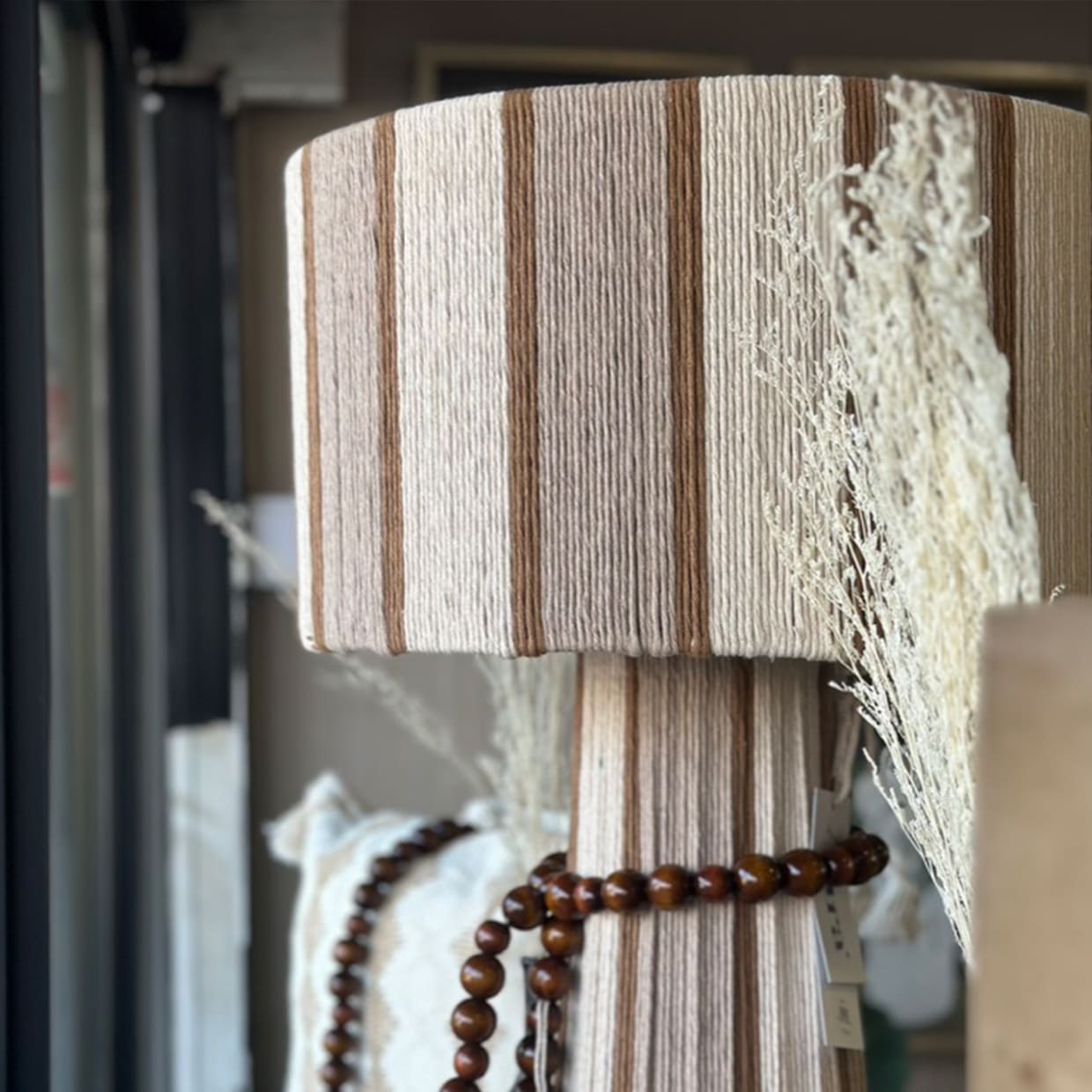 combinando una estructura firme y equilibrada con el toque suave del algodón cuidadosamente entrelazado. Su diseño se distingue por sus líneas limpias y proporcionadas, y por una caída visual que envuelve la pantalla y la base con armonía y presencia. La verticalidad de su forma aporta calidez, carácter y un efecto visual que realza cualquier ambiente.