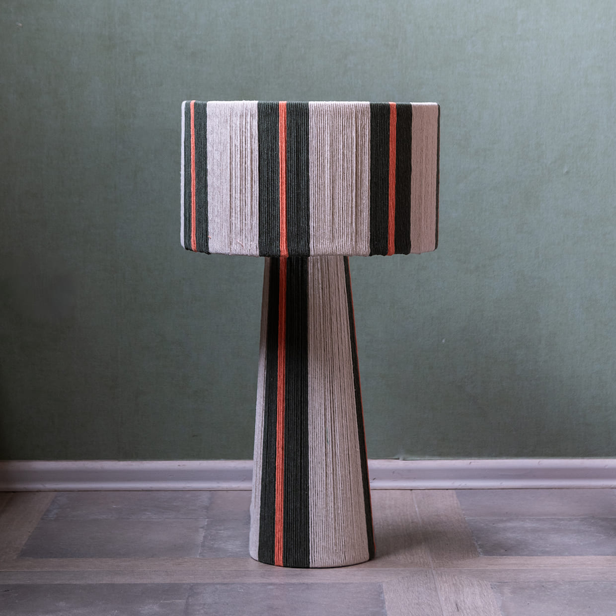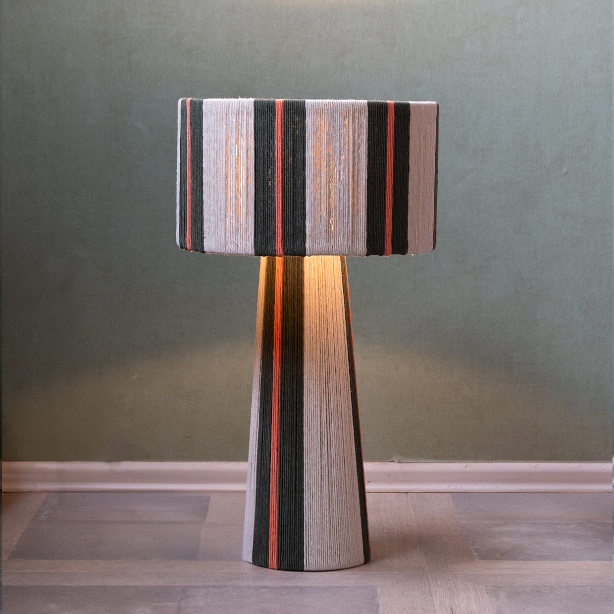 combinando una estructura firme y equilibrada con el toque suave del algodón cuidadosamente entrelazado. Su diseño se distingue por sus líneas limpias y proporcionadas, y por una caída visual que envuelve la pantalla y la base con armonía y presencia. La verticalidad de su forma aporta calidez, carácter y un efecto visual que realza cualquier ambiente.