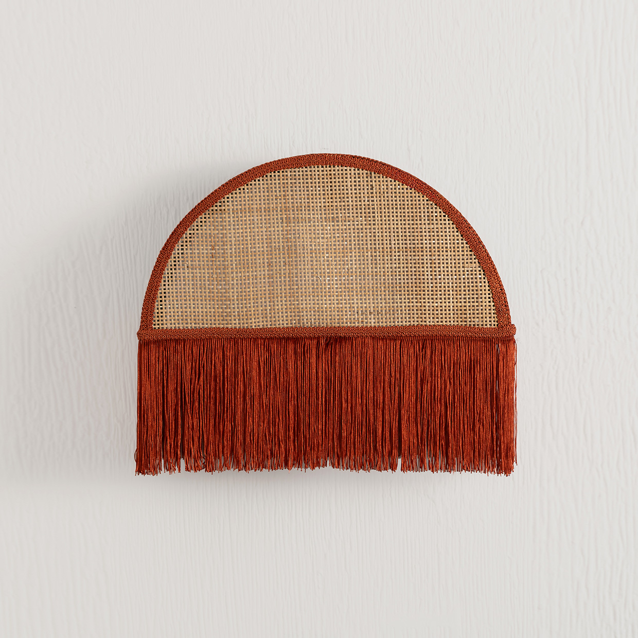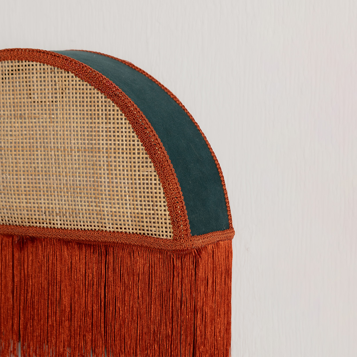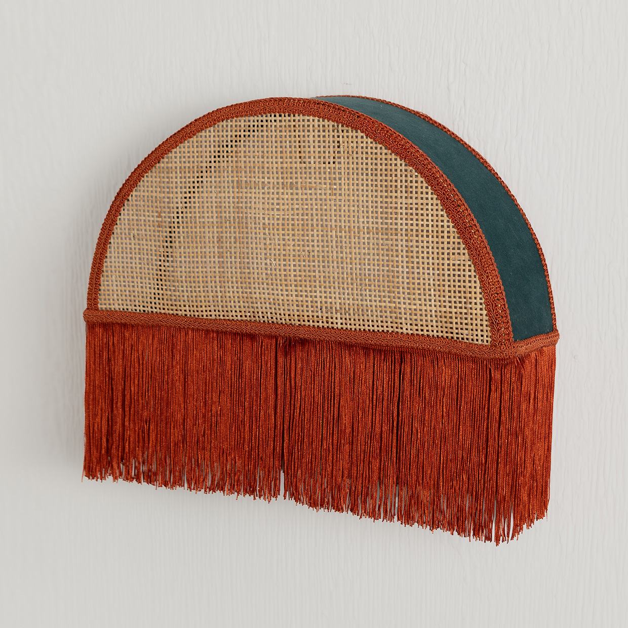 de diseño escultural y textil, creada para aportar calidez y carácter decorativo en espacios donde la luz se convierte en un elemento de diseño. Su estructura en forma de semicírculo combina mimbre natural con terciopelo en tono petróleo y se remata con flecos naranjos que caen suavemente, generando un efecto visual atractivo y lleno de personalidad.