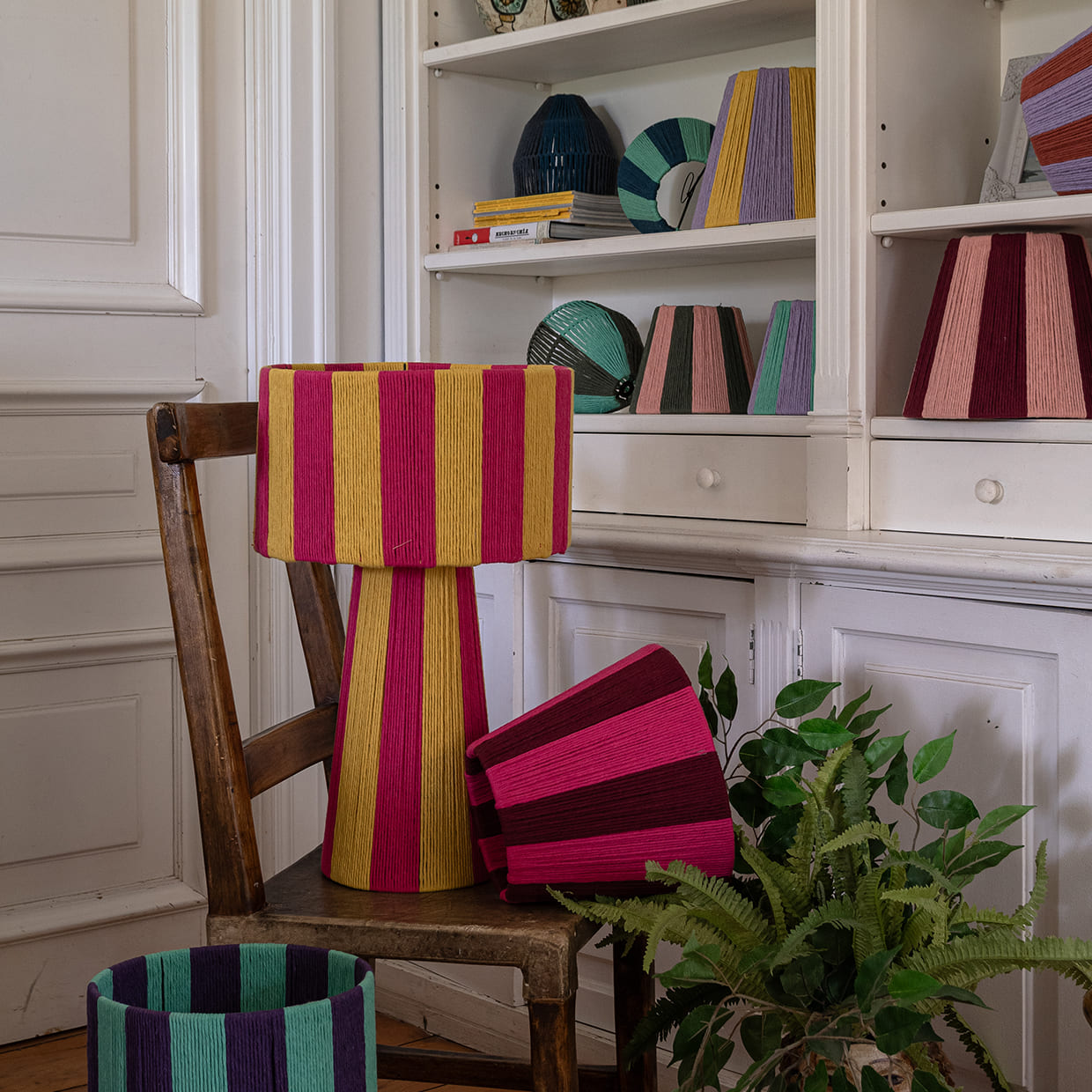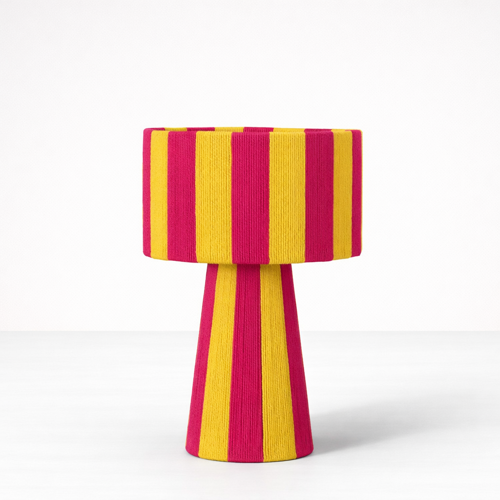 combinando una estructura firme y equilibrada con el toque suave del algodón cuidadosamente entrelazado. Su diseño se distingue por sus líneas limpias y proporcionadas, y por una caída visual que envuelve la pantalla y la base con armonía y presencia. La verticalidad de su forma aporta calidez, carácter y un efecto visual que realza cualquier ambiente.