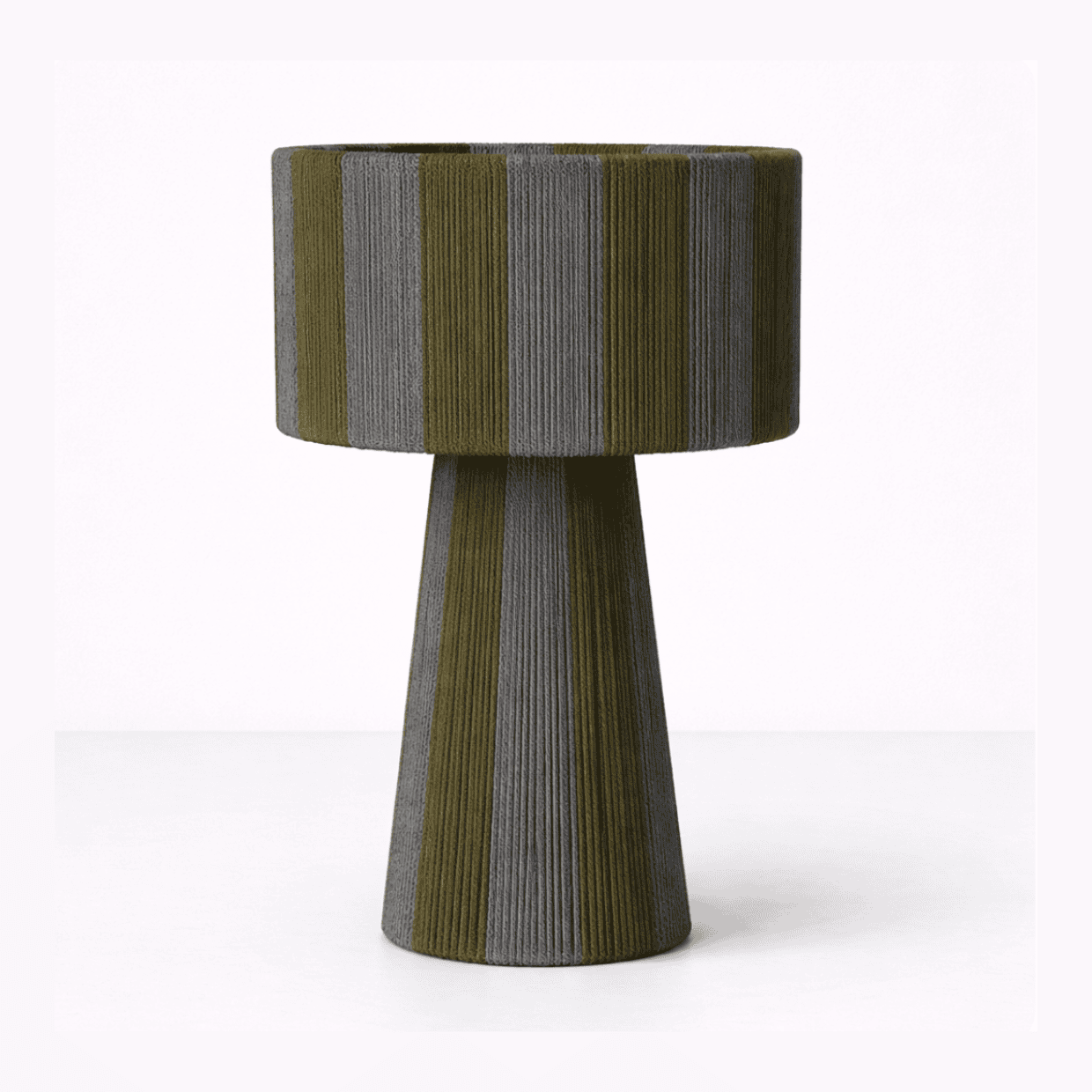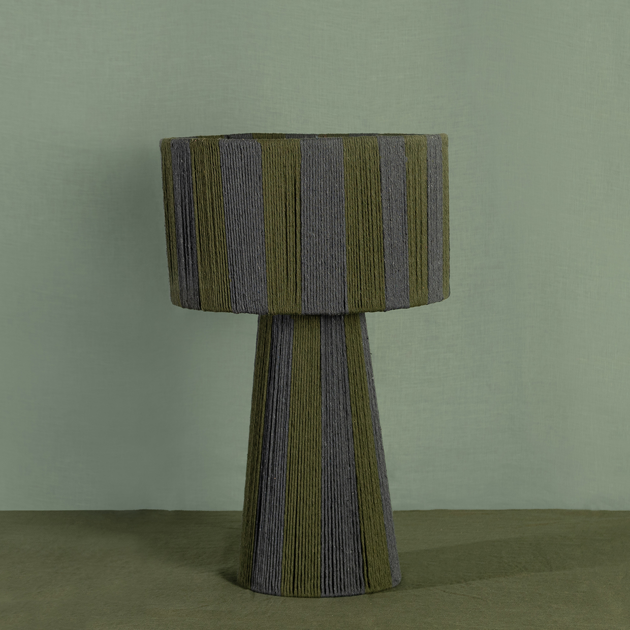 combinando una estructura firme y equilibrada con el toque suave del algodón cuidadosamente entrelazado. Su diseño se distingue por sus líneas limpias y proporcionadas, y por una caída visual que envuelve la pantalla y la base con armonía y presencia. La verticalidad de su forma aporta calidez, carácter y un efecto visual que realza cualquier ambiente.