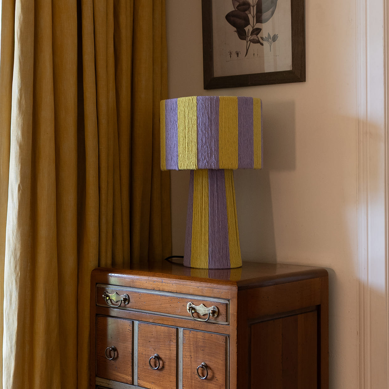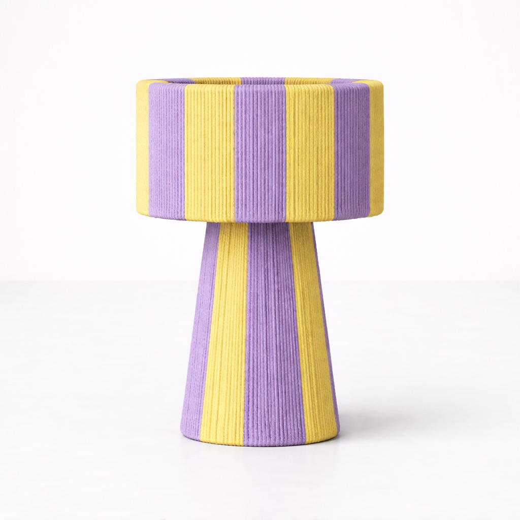 combinando una estructura firme y equilibrada con el toque suave del algodón cuidadosamente entrelazado. Su diseño se distingue por sus líneas limpias y proporcionadas, y por una caída visual que envuelve la pantalla y la base con armonía y presencia. La verticalidad de su forma aporta calidez, carácter y un efecto visual que realza cualquier ambiente.