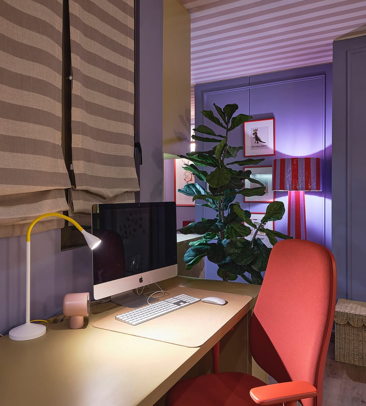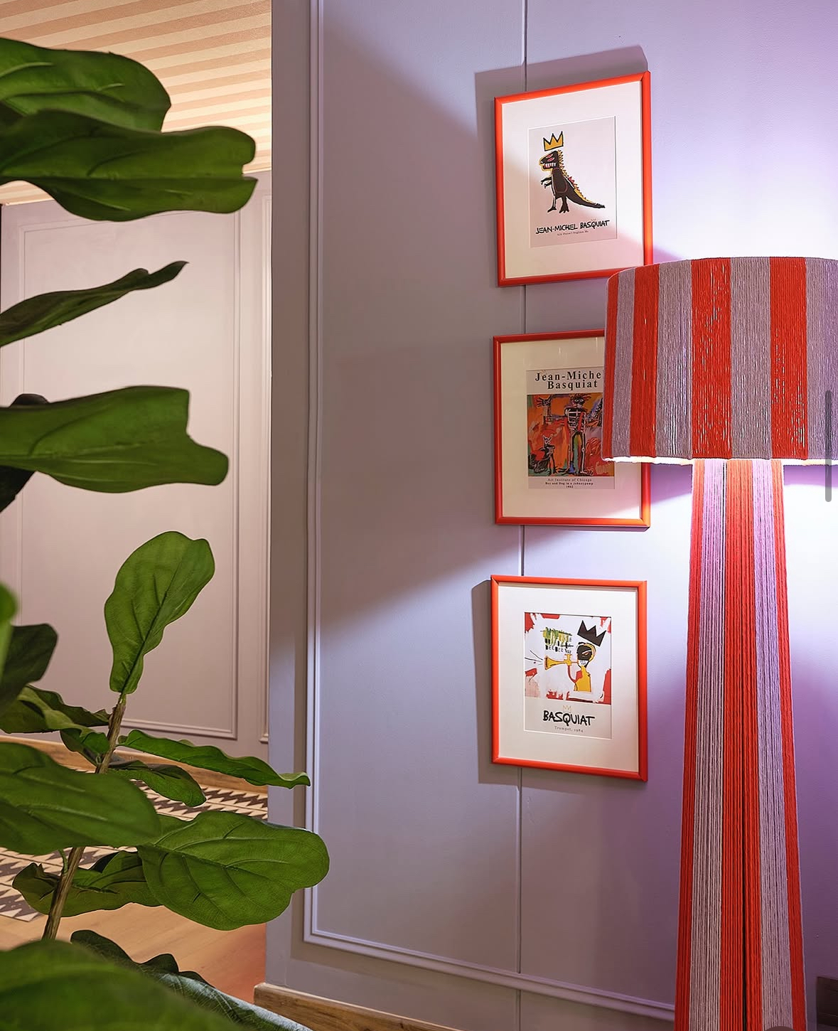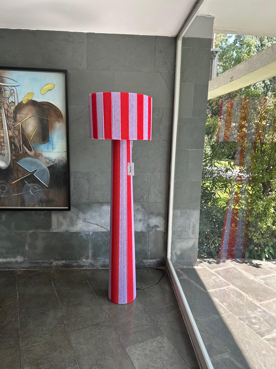 combina una estructura sólida y estilizada con la suavidad del algodón entrelazado, creando un equilibrio visual que aporta altura, presencia y calidez a cualquier espacio. Su diseño vertical destaca por sus líneas simples y definidas, mientras que la pantalla aporta textura y profundidad gracias al entramado de colores.