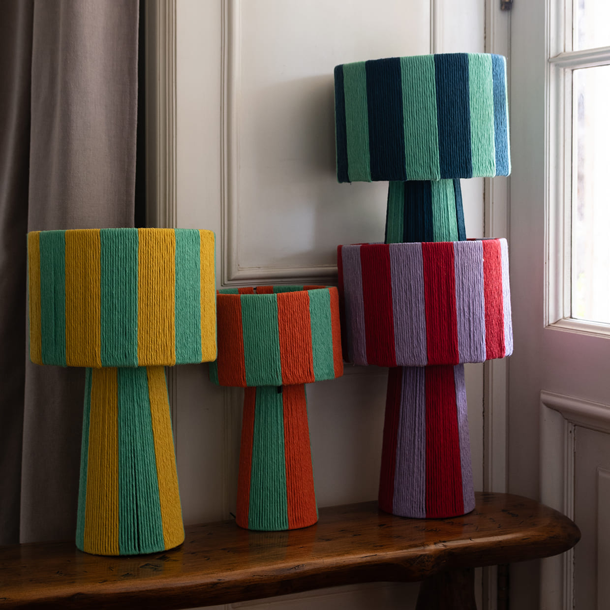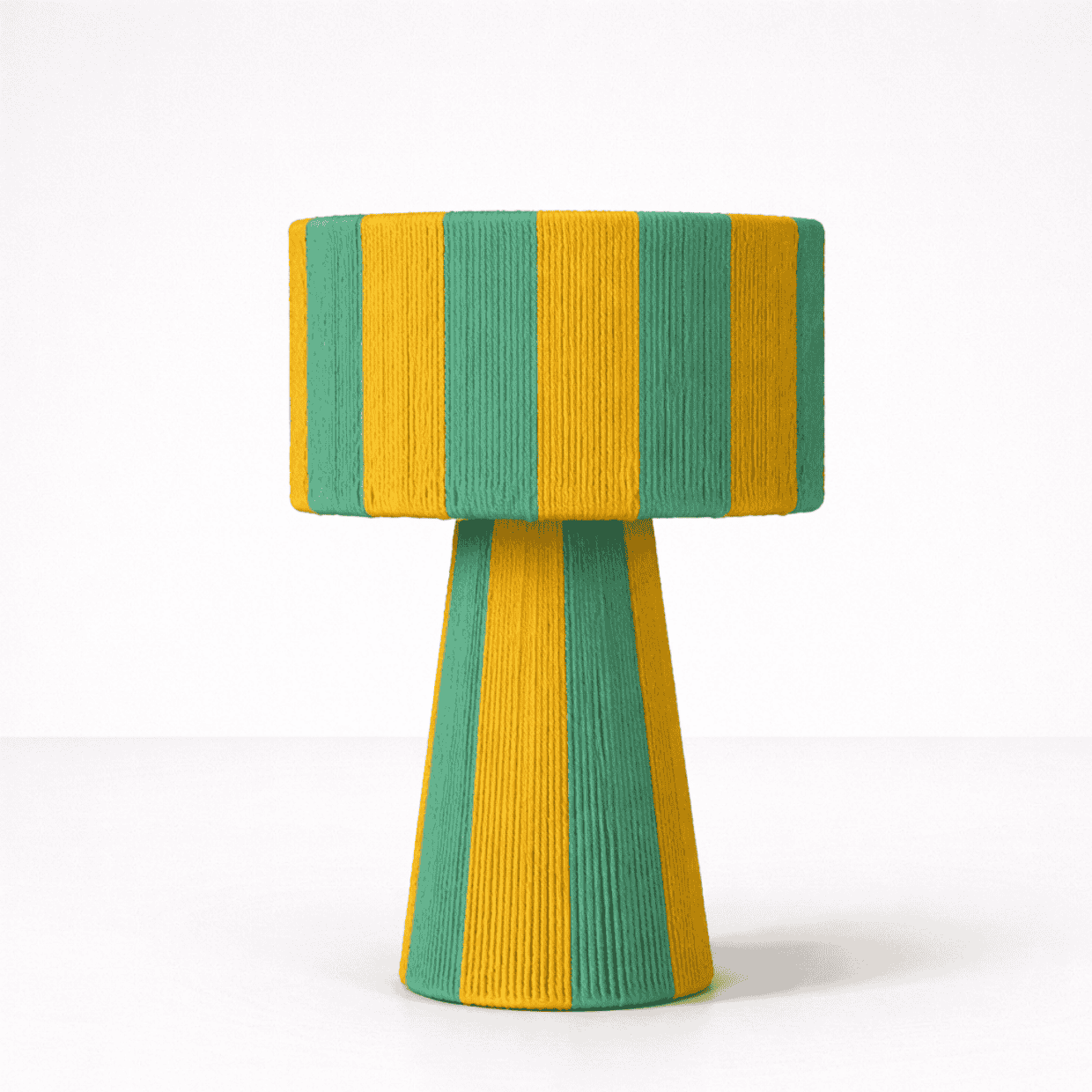 combinando una estructura firme y equilibrada con el toque suave del algodón cuidadosamente entrelazado. Su diseño se distingue por sus líneas limpias y proporcionadas, y por una caída visual que envuelve la pantalla y la base con armonía y presencia. La verticalidad de su forma aporta calidez, carácter y un efecto visual que realza cualquier ambiente.