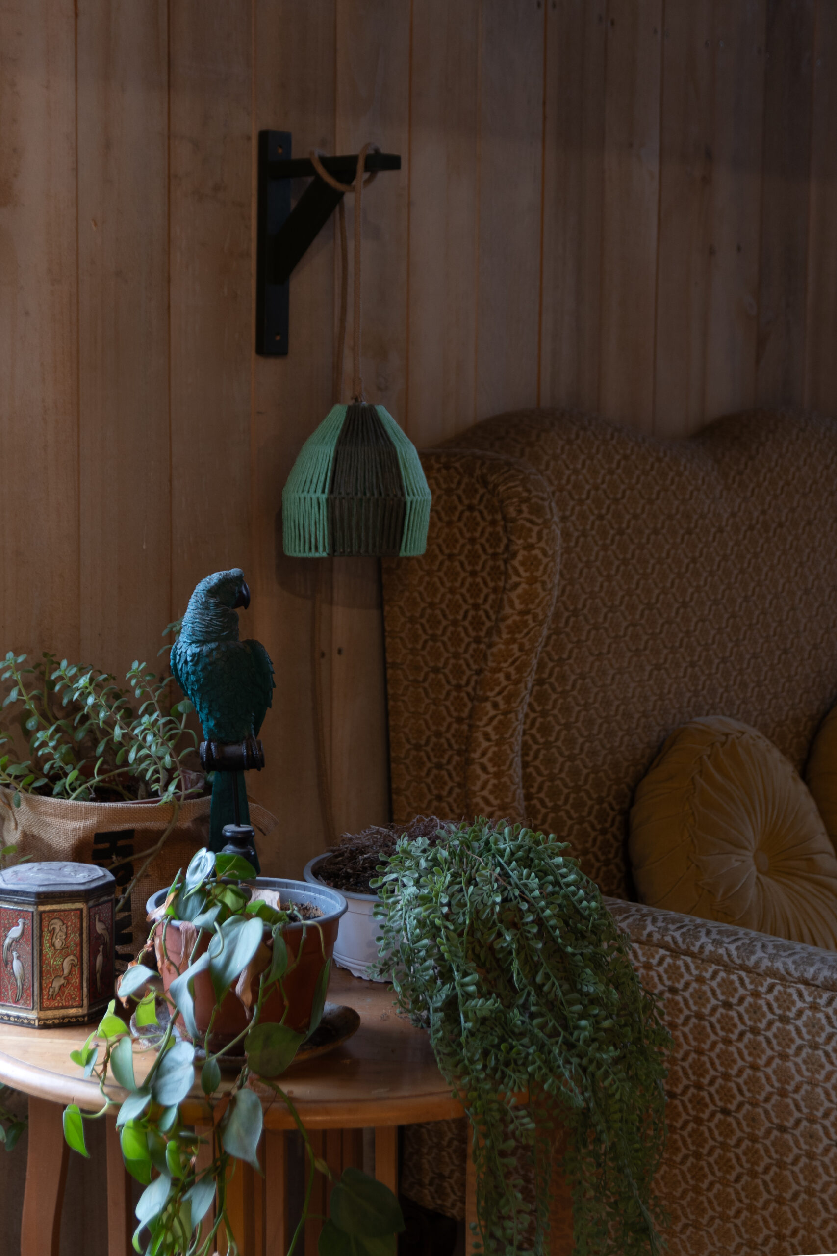 diseñada para aportar calidez y carácter a rincones especiales. Instalada sobre una escuadra de madera, su caída textil envuelta en hilo genera una iluminación suave y acogedora, ideal para espacios infantiles, rincones de lectura, pasillos o zonas donde se busca luz ambiental con un toque decorativo.