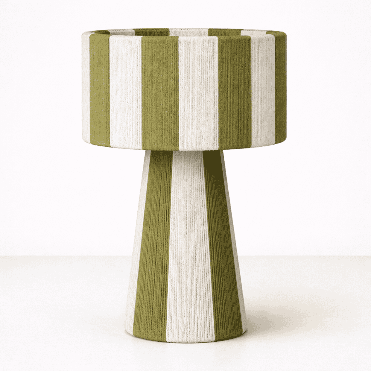 combinando una estructura firme y equilibrada con el toque suave del algodón cuidadosamente entrelazado. Su diseño se distingue por sus líneas limpias y proporcionadas, y por una caída visual que envuelve la pantalla y la base con armonía y presencia. La verticalidad de su forma aporta calidez, carácter y un efecto visual que realza cualquier ambiente.