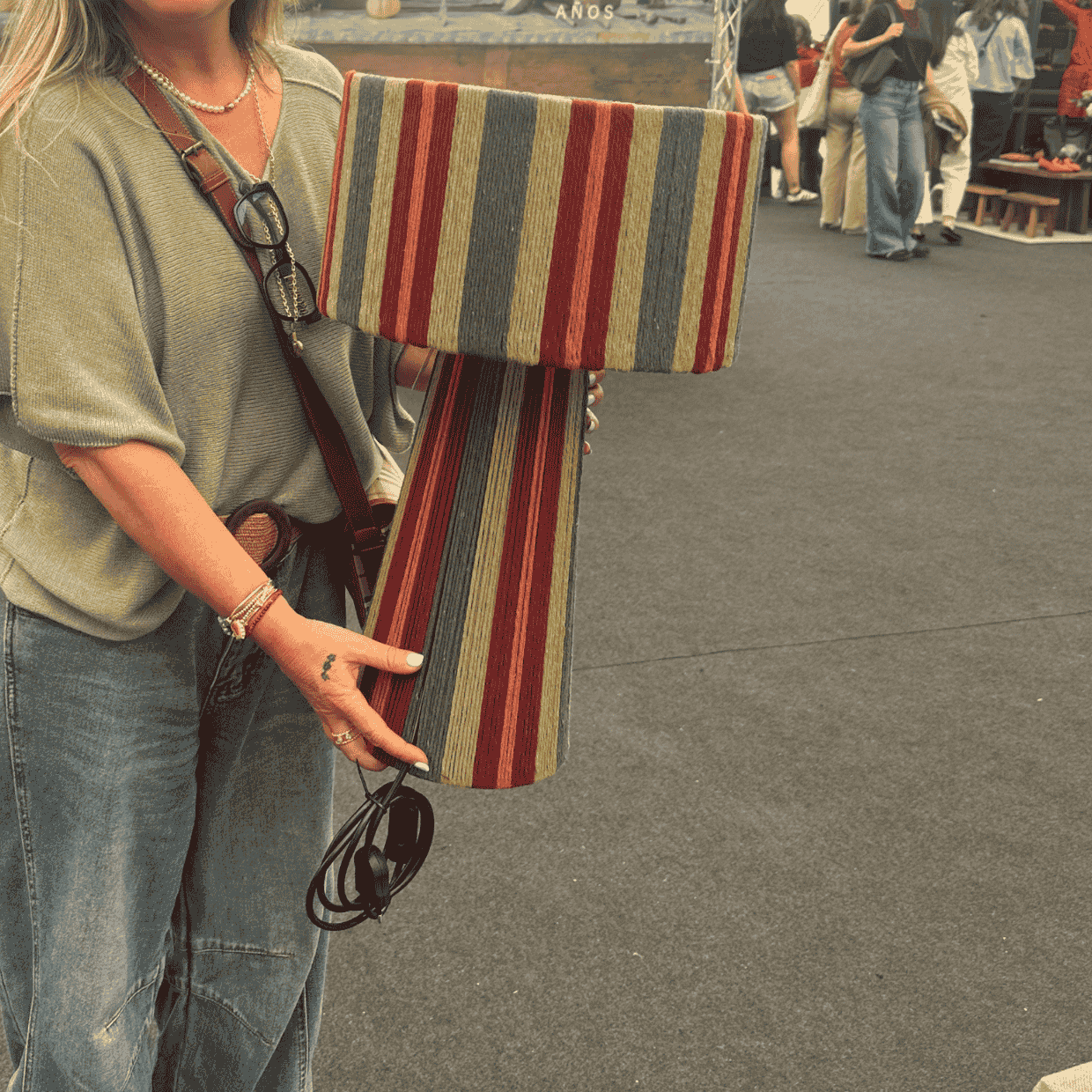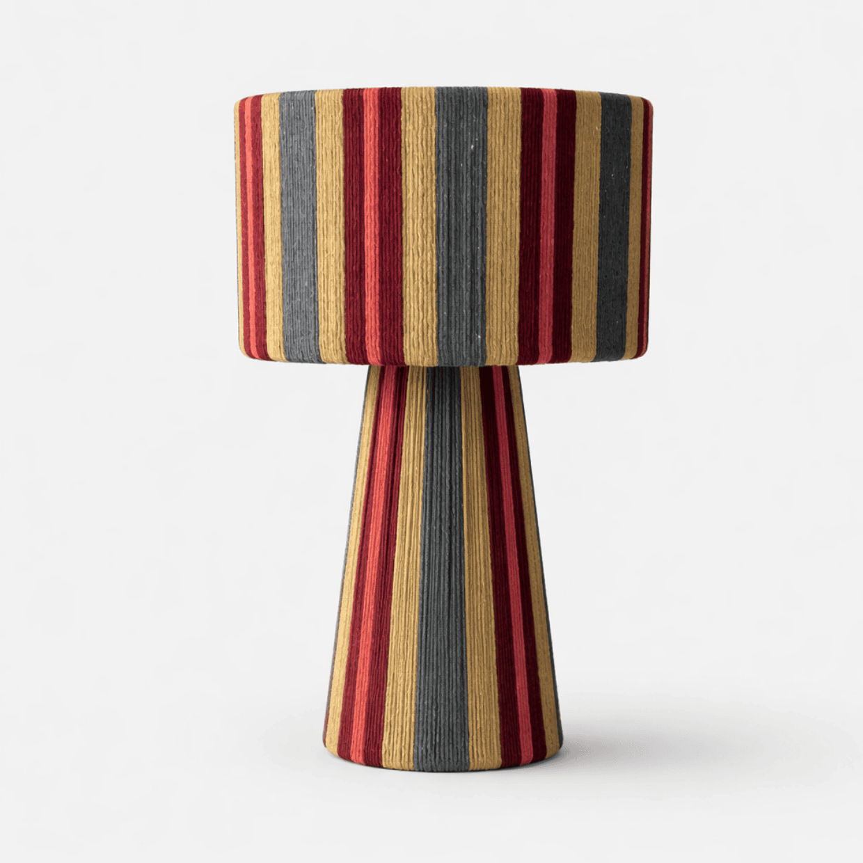 combinando una estructura firme y equilibrada con el toque suave del algodón cuidadosamente entrelazado. Su diseño se distingue por sus líneas limpias y proporcionadas, y por una caída visual que envuelve la pantalla y la base con armonía y presencia. La verticalidad de su forma aporta calidez, carácter y un efecto visual que realza cualquier ambiente.