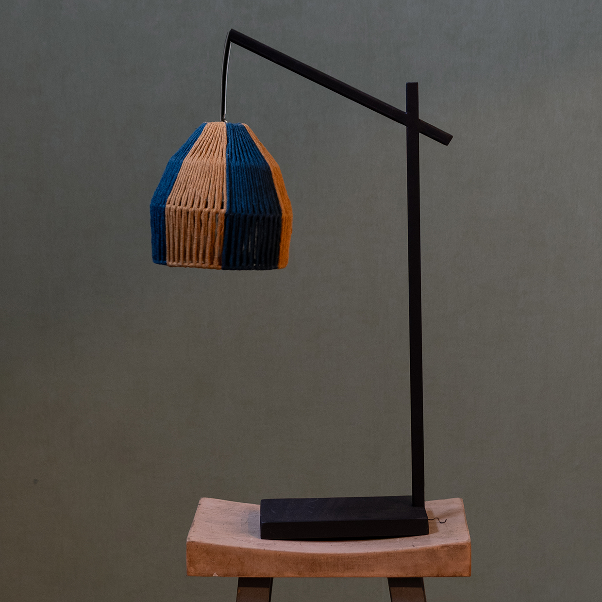 combina una estructura firme y estilizada con la suavidad del algodón entrelazado, creando un contraste equilibrado entre líneas definidas y textura acogedora. Su diseño proyecta luz focalizada y cálida, perfecta para rincones, mesas laterales o espacios que buscan un toque moderno y sutil.