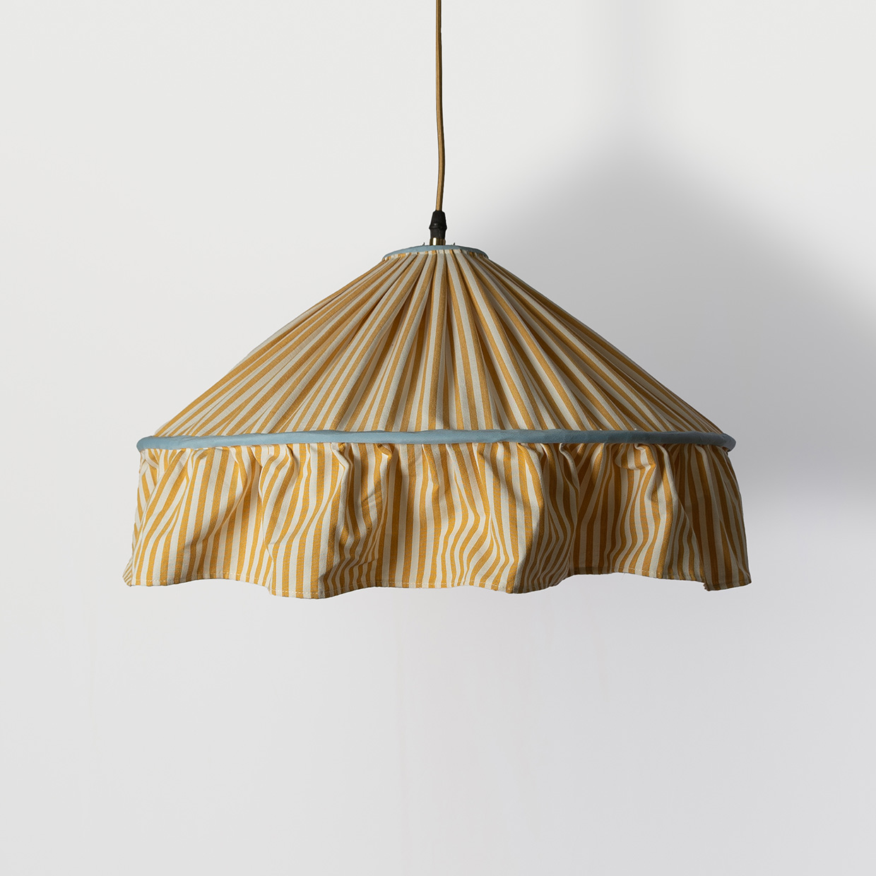 es una pieza única hecha totalmente a medida. Confeccionada en tela a rayas amarillo con blanca y terminada con un delicado ribete en tono celeste, cada lámpara es cosida a mano y plisada cuidadosamente sobre una estructura de fierro diseñada especialmente para ella. El faldón con volantes aporta movimiento, calidez y un encanto atemporal. A diferencia de otras lámparas, las Rolling colgantes no están forradas, permitiendo que la luz atraviese la tela y genere un efecto vibrante, cálido y envolvente al encenderse.