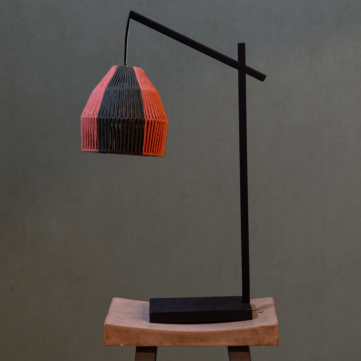 combina una estructura firme y estilizada con la suavidad del algodón entrelazado, creando un contraste equilibrado entre líneas definidas y textura acogedora. Su diseño proyecta luz focalizada y cálida, perfecta para rincones, mesas laterales o espacios que buscan un toque moderno y sutil.